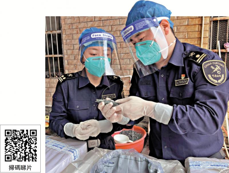 圖:中國海關部門加強檢測,確保進口水產品安全。圖為廣東湛江海關關員對進口蝦進行檢疫監管。\新華社