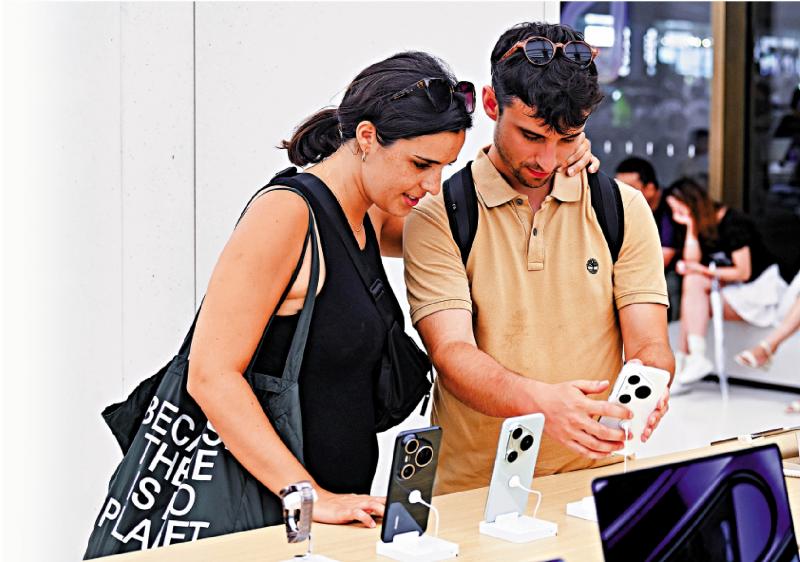 圖:在免簽「朋友圈」持續擴容以及離境退稅「即買即退」政策的推動下,「中國遊」持續升溫,「中國購」也成為入境遊新趨勢。圖為兩名西班牙遊客在位於上海市南京路步行街的華為商店裏瀏覽手機產品。\新華社