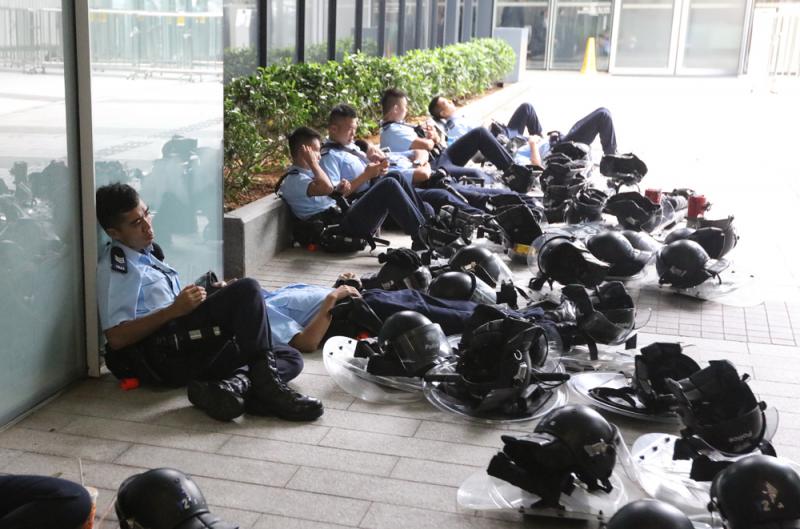 圖:警方長時間在風雨中維持秩序而精疲力盡