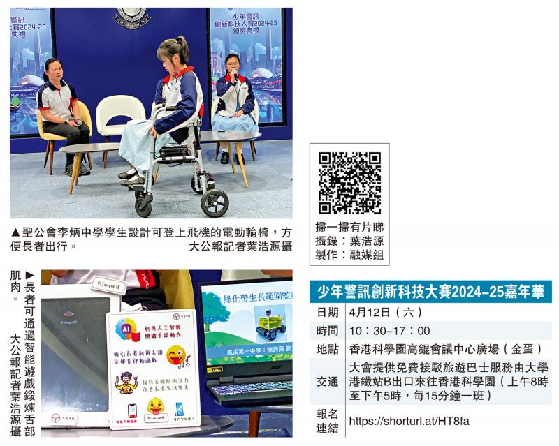 【大公報訊】記者葉浩源報道:由香港警務處主辦、中銀香港全力支持的「少年警訊創新科技大賽2024-25」,將於本周六(12日)假香港科學園舉行頒獎典禮暨嘉年華。今屆比賽以「智慧城市」為題,四支得獎隊伍日前率先向傳媒展示作品及分享創作理念,包括幫助長者訓練喉嚨及舌頭以解決吞嚥困難的AI電子遊戲、可登上飛機使用行動電源的電動輪椅兼助行器等作品。同時,頒獎禮當日亦將舉行創科嘉年華,設有VR虛擬實境激流艇、AI詠春拳館遊戲攤位及KOL親子社交媒體工作坊等開放給公眾免費參與。