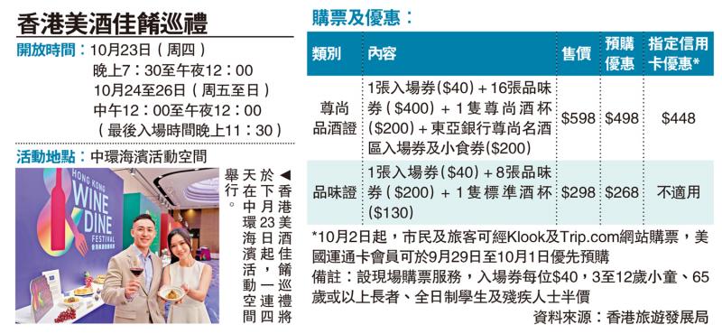 【大公報訊】記者賴振雄報道:一年一度的香港美酒佳餚巡禮,將於下月23日起,一連四天在中環海濱活動空間舉行,開放時間首次延長至午夜12時,並引入「味覺配對」,讓入場人士自行配搭美酒。旅遊發展局預計,四天活動吸引約15萬入場人次,與去年相若。
