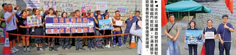 圖:市民昨日繼續自發到美國駐港總領館門前抗議,不滿美國早前發表報告抹黑香港營商環境。