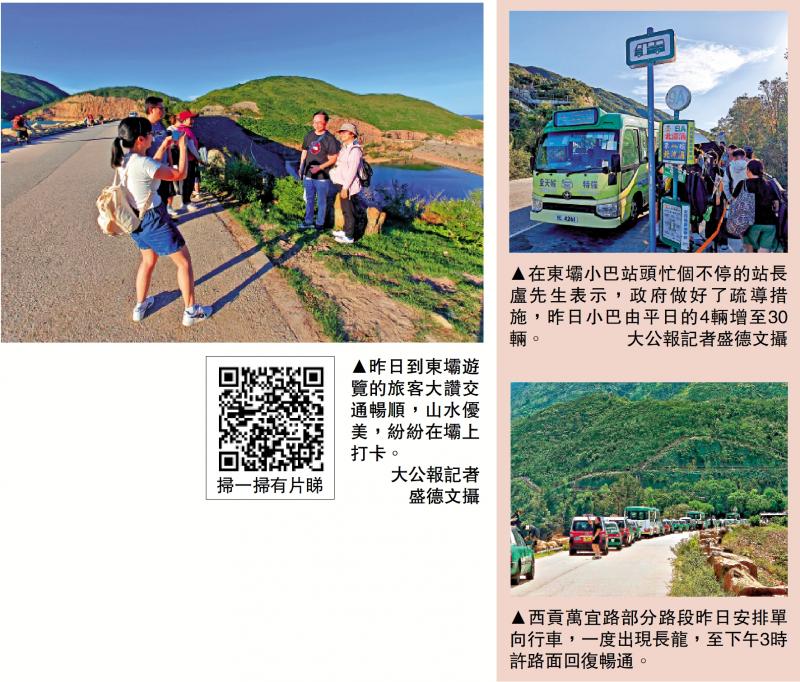左圖:昨日到東壩遊覽的旅客大讚交通暢順,山水優美,紛紛在壩上打卡。\大公報記者盛德文攝;右上圖:在東壩小巴站頭忙個不停的站長盧先生表示,政府做好了疏導措施,昨日小巴由平日的4輛增至30輛。\大公報記者盛德文攝;右下圖:西貢萬宜路部分路段昨日安排單向行車,一度出現長龍,至下午3時許路面回復暢通。