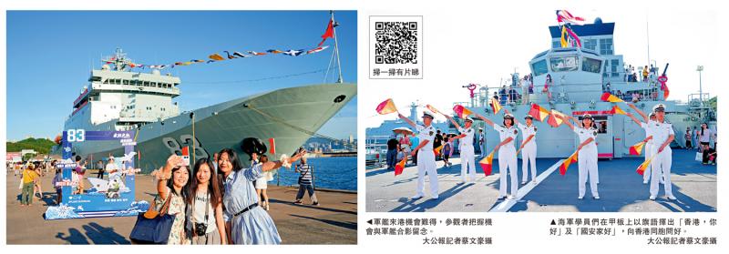 左圖:軍艦來港機會難得,參觀者把握機會與軍艦合影留念。右圖:海軍學員們在甲板上以旗語揮出「香港,你好」及「國安家好」,向香港同胞問好。\大公報記者蔡文豪攝