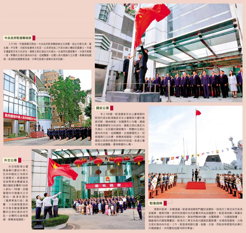 10月1日清晨,中央人民政府駐香港特別行政區聯絡辦公室、中央人民政府駐香港特別行政區維護國家安全公署、外交部駐香港特別行政區特派員公署、中國人民解放軍駐香港部隊等中央駐港機構同時舉行升旗儀式,慶祝中華人民共和國成立76周年。\大公報記者 龔學鳴