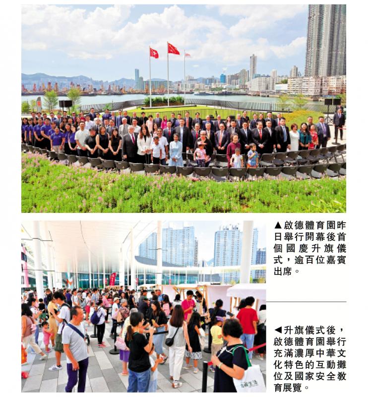 上圖:啟德體育園昨日舉行開幕後首個國慶升旗儀式,逾百位嘉賓出席。下圖:升旗儀式後,啟德體育園舉行充滿濃厚中華文化特色的互動攤位及國家安全教育展覽。