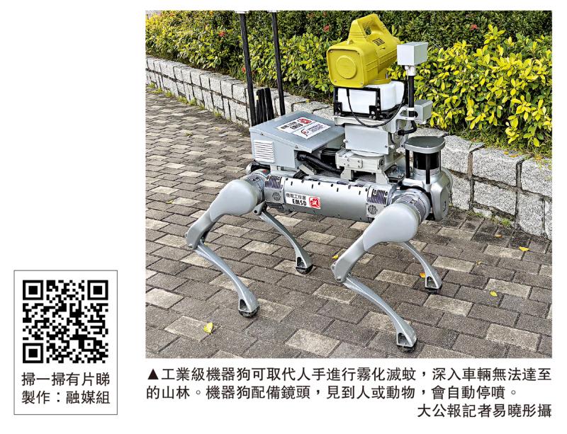 圖:工業級機器狗可取代人手進行霧化滅蚊,深入車輛無法達至的山林。機器狗配備鏡頭,見到人或動物,會自動停噴。\大公報記者易曉彤攝