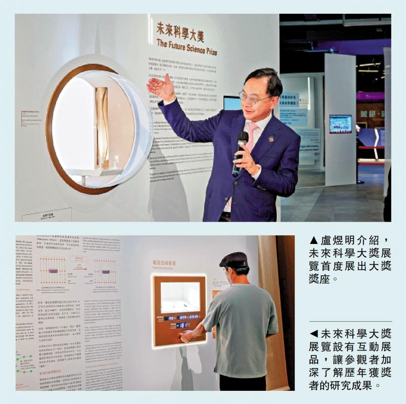 上圖:盧煜明介紹,未來科學大獎展覽首度展出大獎獎座。下圖:未來科學大獎展覽設有互動展品,讓參觀者加深了解歷年獲獎者的研究成果。