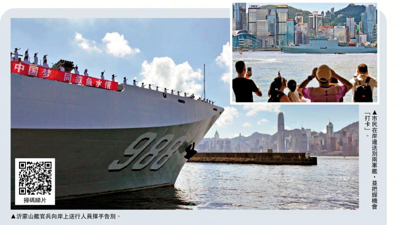 隨後,戚繼光艦、沂蒙山艦依次駛離昂船洲軍營碼頭。離港途中,熱情的香港市民們自發齊聚在維多利亞港岸邊,與屬艦官兵揮手告別。兩艘艦艇在大家依依不捨的目光中駛離區界。