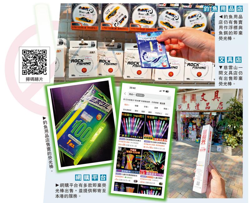 記者及後也前往釣魚用品店了解,發現有商戶仍在售賣用作浮標與魚餌的即棄熒光棒。位於佐敦渡船街的一間釣魚用品店,可購買從日本進口,用作夜釣的即棄熒光棒,店主表示自己也不清楚該類用作夜釣的熒光棒是否也被歸類於「走塑」範圍內禁止銷售的商品之一,但該類進口的熒光棒在日本已經很少售賣,取而代之的是用電的熒光棒。另一間在深水埗鴨寮街的釣魚用品店也有銷售用作浮標、小顆的即棄熒光棒。