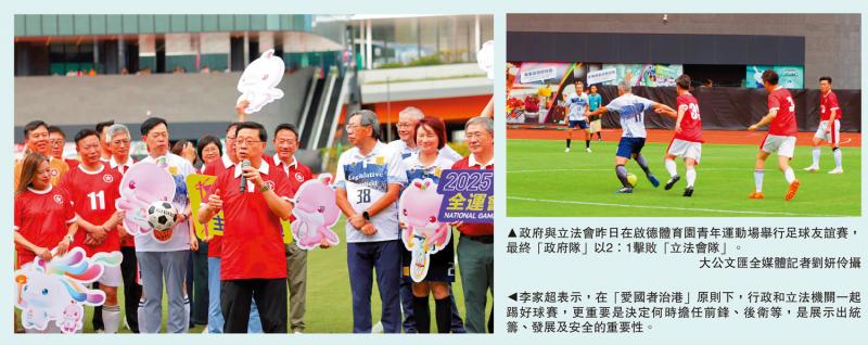 左圖:李家超表示,在「愛國者治港」原則下,行政和立法機關一起踢好球賽,更重要是決定何時擔任前鋒、後衛等,是展示出統籌、發展及安全的重要性。右圖:政府與立法會昨日在啟德體育園青年運動場舉行足球友誼賽,最終「政府隊」以2:1擊敗「立法會隊」。\大公文匯全媒體記者劉妍伶攝