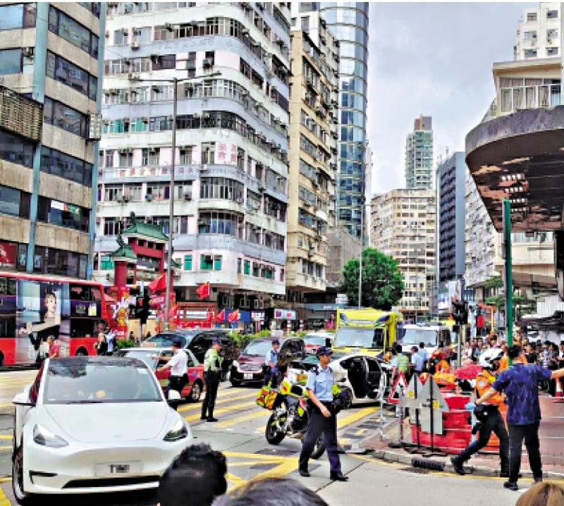 圖:佐敦道昨日發生嚴重交通意外,一輛私家車被撞剷上行人路,造成7人受傷。