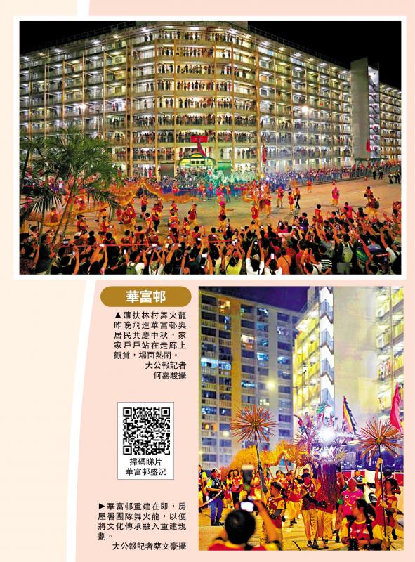 上圖:薄扶林村舞火龍昨晚飛進華富邨與居民共慶中秋,家家戶戶站在走廊上觀賞,場面熱鬧。\大公報記者何嘉駿攝;下圖:華富邨重建在即,房屋署團隊舞火龍,以便將文化傳承融入重建規劃。\大公報記者蔡文豪攝。