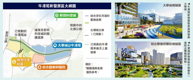 政府為配合鄰近的新田科技城的創科發展及北都人口增長,預計會在牛潭尾新發展區提供約1.3萬個住宅單位。而綜合醫教研醫院的選址並沒有採取鄰近的方案,但會有24小時開放的行人通道連接。\大公報記者 程進