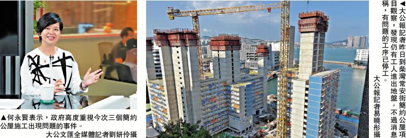 左圖:何永賢表示,政府高度重視今次三個簡約公屋施工出現問題的事件。\大公文匯全媒體記者劉妍伶攝;右圖:大公報記者昨日到柴灣常安街簡約公屋項目觀察,發現仍有工人進出地盤。不過消息稱,有問題的工序已停工。\大公報記者易曉彤攝