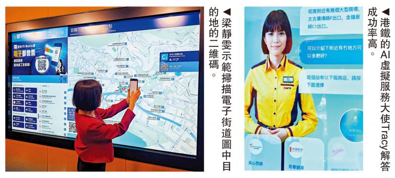左圖:梁靜雯示範掃描電子街道圖中目的地的二維碼。右圖:港鐵的AI虛擬服務大使Tracy解答成功率高。