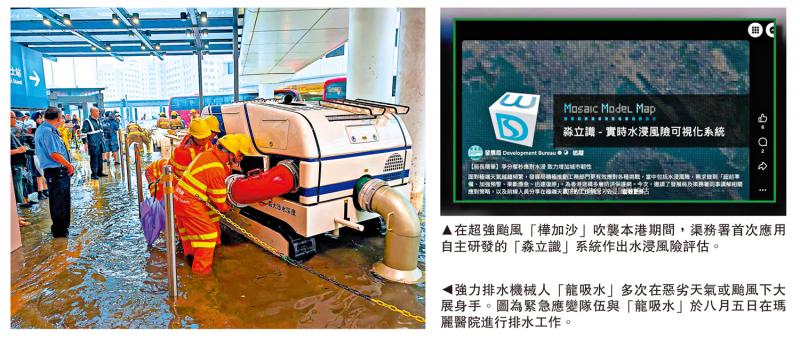 左圖:強力排水機械人「龍吸水」多次在惡劣天氣或颱風下大展身手。圖為緊急應變隊伍與「龍吸水」於八月五日在瑪麗醫院進行排水工作。右圖:在超強颱風「樺加沙」吹襲本港期間,渠務署首次應用自主研發的「淼立識」系統作出水浸風險評估。