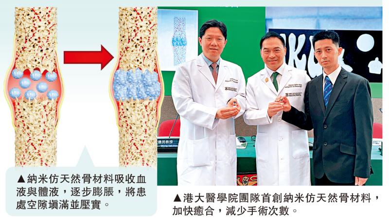 左圖:納米仿天然骨材料吸收血液與體液,逐步膨脹,將患處空隙填滿並壓實。右圖:港大醫學院團隊首創納米仿天然骨材料,加快癒合,減少手術次數。