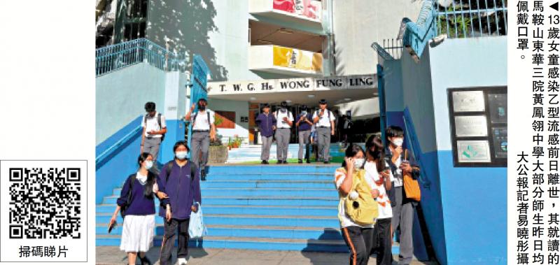 一名感染乙型流感的13歲女童前日(12日)離世,是本港今年首宗兒童感染流感死亡個案。大公報記者昨日走訪該女童就讀的馬鞍山東華三院黃鳳翎中學,發現校內大部分師生均佩戴口罩,有學生攜鮮花悼念。校方表示,昨日已取消早會避免人群聚集,並已向家長通報事件,呼籲家長盡快為子女安排免費接種季節性流感疫苗,而校方早前已安排於下月10日進行流感疫苗注射。