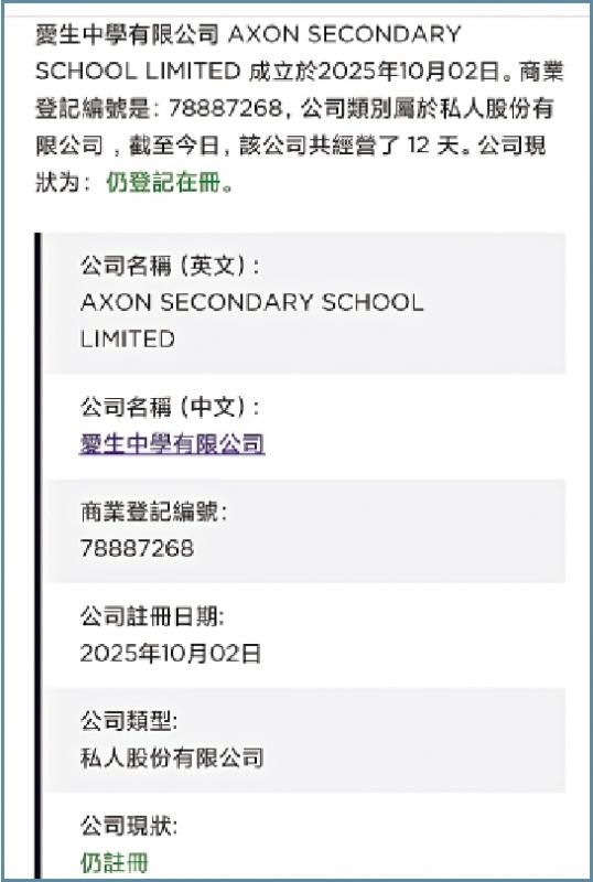 圖:公司註冊顯示,「愛生中學」於今年10月2日成立,至今不足兩周。