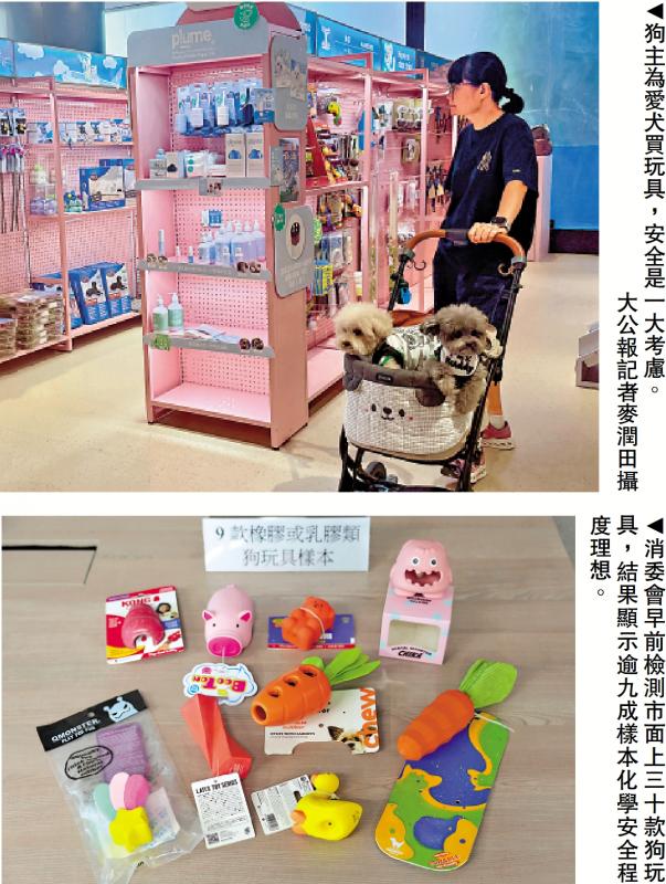 上圖:狗主為愛犬買玩具,安全是一大考慮。\大公報記者麥潤田攝;下圖:消委會早前檢測市面上三十款狗玩具,結果顯示逾九成樣本化學安全程度理想。
