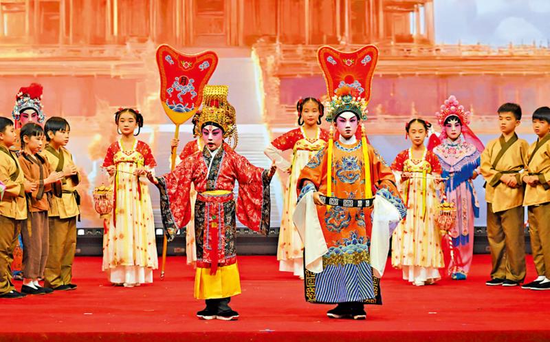 圖:聯校國民教育活動舉行啟動禮,學生在台上表演粵劇。