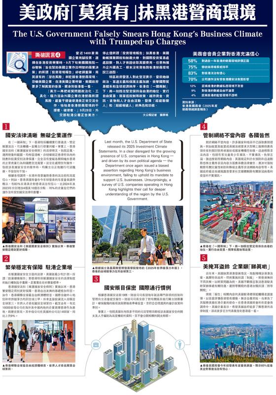 「美方一再把經貿問題政治化、工具化,極力渲染外國企業在港營商所謂風險,嚴重干擾破壞港美正常交流合作,恰恰是香港營商環境的干擾者、破壞者。」9月28日,外交部駐港公署正告美方,停止借所謂「投資環境報告」抹黑香港。美國動輒揮舞關稅和制裁大棒,對國際投資貿易處處設限,對人才簽證收取高額費用,任意拘捕外企外國員工,根本沒有資格對香港營商環境說三道四。