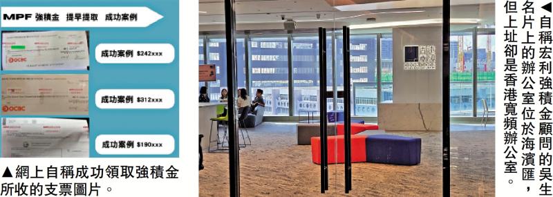 左圖:網上自稱成功領取強積金所收的支票圖片。右圖:自稱宏利強積金顧問的吳生名片上的辦公室位於海濱匯,但上址卻是香港寬頻辦公室。