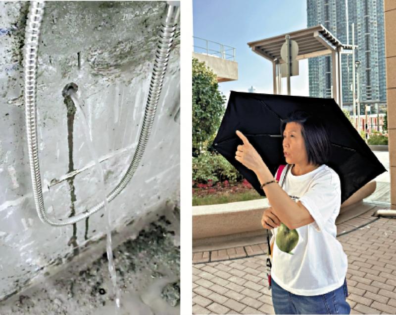 圖:社交平台傳播的視頻顯示,啟悅苑一個單位牆身有滲水痕跡,還有水流出。屋苑另一位業主韓女士看了視頻表示打消改動廁所水喉的念頭。