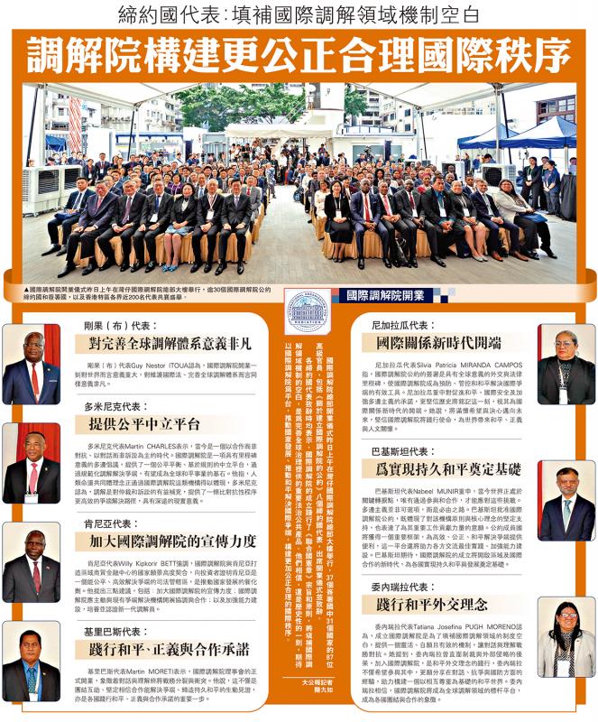 各締約國代表致辭時均表示,國際調解院的成立踐行了《聯合國憲章》宗旨和原則,將填補國際調解領域機制的空白,是為完善全球治理提供的重要法治公共產品。他們相信,這是歷史性的一刻,期待以國際調解院為平台,推動國家發展、推動和平解決國際爭端,構建更加公正合理的國際秩序。\大公報記者 陸九如