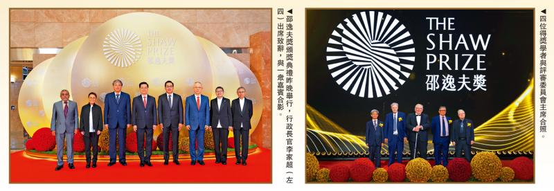 左圖:邵逸夫獎頒獎典禮昨晚舉行,行政長官李家超(左四)出席致辭,與一眾嘉賓合影。右圖:四位得獎學者與評審委員會主席合照。