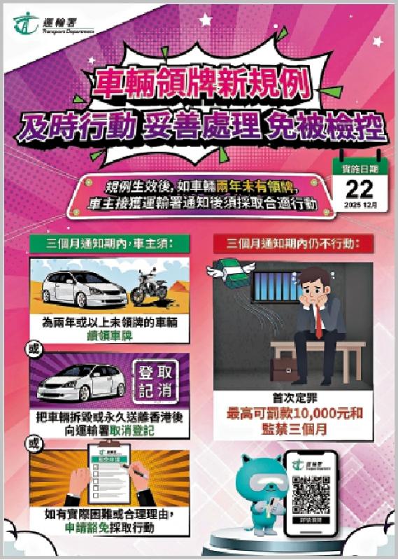運輸署昨日(21日)在社交網頁表示,新制度實施後,署方會向兩年或以上未領牌車輛的登記車主發出通知,要在3個月內續領車牌、劏車或永久送離本港後取消登記,如有困難或合理理由須申請豁免,否則即屬犯罪。車主需留意名下車輛的牌照狀況,確保完成登記及領牌手續。
