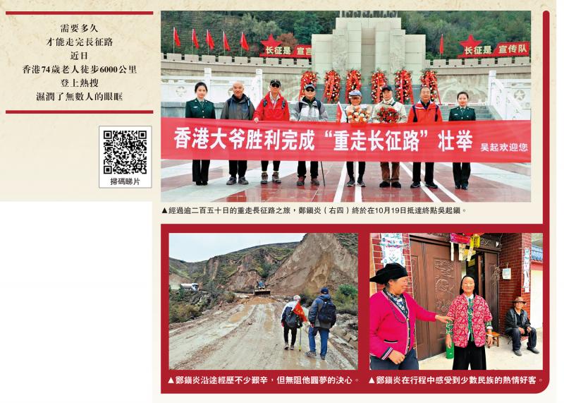 74歲的香港資深傳媒人鄭鎮炎,去年10月17日從江西于都出發,徒步6000多公里、重走當年紅軍長征路,《大公報》率先報道並持續跟進此一壯舉,報道引發廣泛關注,社會熱烈回響。鄭鎮炎老人近日抵達長征終點陝北吳起鎮,各大媒體與網絡平台連日來持續爭相報道。