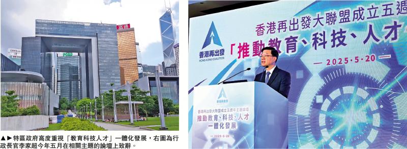 圖:特區政府高度重視「教育科技人才」一體化發展,右圖為行政長官李家超今年五月在相關主題的論壇上致辭。