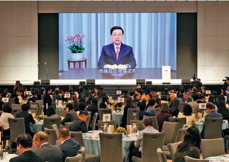 圖:李家超視像致辭表示,香港在「一國兩制」下享有國家機遇和國際機遇的雙重疊加優勢,正是其勇於識變求變、突破轉型的最大底氣。\大公報記者林少權攝