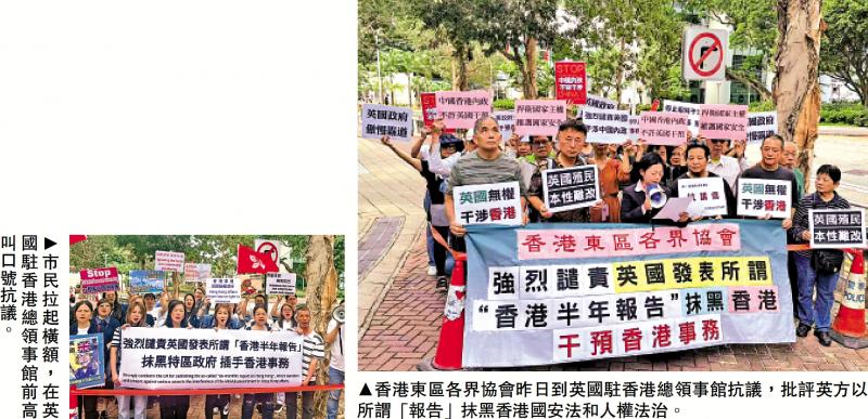 香港東區各界協會譴責,英國政府發表所謂「香港問題半年報告」,抹黑香港國安法,粗暴干涉中國內政。該會敦促英國正視香港已經回歸中國28年的事實,正視香港正走向由治及興的事實,多做對於中英關係有利的事。