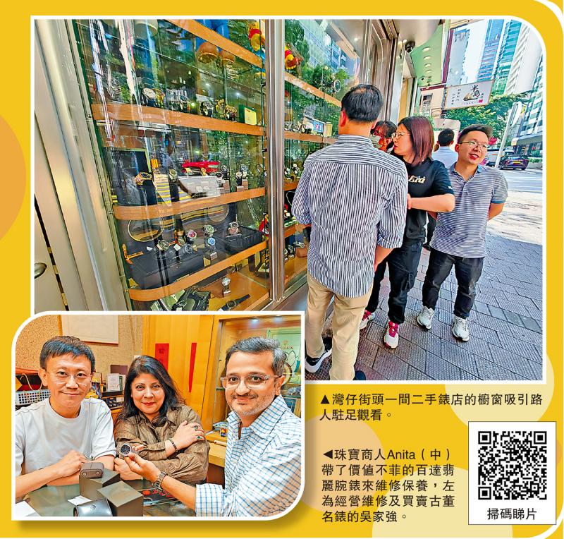 左圖:珠寶商人Anita(中)帶了價值不菲的百達翡麗腕錶來維修保養,左為經營維修及買賣古董名錶的吳家強。右圖:灣仔街頭一間二手錶店的櫥窗吸引路人駐足觀看。