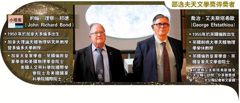 2025年度邵逸夫天文學獎近日頒予加拿大理論天體物理研究所教授約翰.理查.邦德(John Richard Bond),及英國劍橋大學天體物理學榮休教授喬治.艾夫斯塔希歐(George Efstathiou),以表彰他們在宇宙學方面的開創性工作,尤其是他們對微波背景輻射漲落的研究,從而精確測定出宇宙的年齡約138億年、幾何結構和質能含量(暗物質與暗能量)。