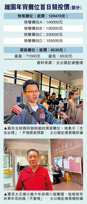 上圖:蘇先生投得四個相連的濕貨攤位,他表示「志在必得」,不惜提高預算。下圖:蘭花大王楊小龍今年投得八個攤檔,他相信市民買年花的錢「不會慳」。\大公報記者易曉彤攝