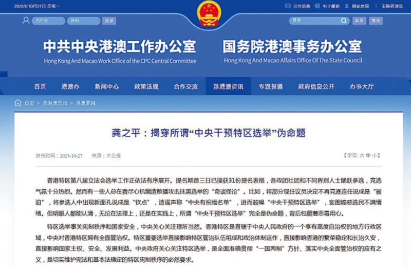 【大公報訊】記者李清報道:10月27日,中央港澳工作辦公室、國務院港澳事務辦公室網站轉載《大公報》題為《龔之平:揭穿所謂「中央干預特區選舉」偽命題》的評論文章。文章指出,中央始終支持香港建設符合自身實際情況的高質量民主。中央反覆強調,在新選舉制度下,選舉回歸選賢舉能的本質,尤為突出公平競爭、良性競爭。任何合資格候選人都將站在同一起跑線上展開競爭,不存在什麼「祝福名單」,也沒有誰享有什麼「特殊待遇」。第八屆立法會選舉意義重大,全體港人尤其是四百多萬合資格選民,一定要擦亮眼睛,識破那些干預破壞選舉的謬論。