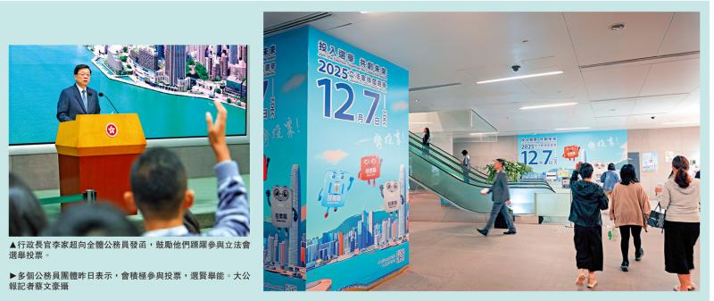 左圖:行政長官李家超向全體公務員發函,鼓勵他們踴躍參與立法會選舉投票。右圖:多個公務員團體昨日表示,會積極參與投票,選賢舉能。\大公報記者蔡文豪攝