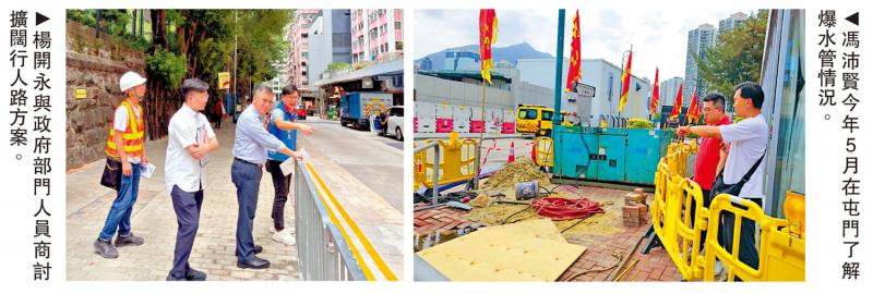 左圖:楊開永與政府部門人員商討擴闊行人路方案。右圖:馮沛賢今年5月在屯門了解爆水管情況。