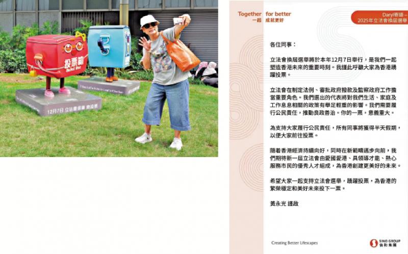 左圖:多個政府部門、公營機構近日紛紛向員工發信,呼籲十二月七日踴躍投票!\大公報記者黃洋港攝;右圖:信和集團主席黃永光昨日向逾萬全體員工發出一封號召信函,呼籲全體員工在立法會選舉踴躍投票,表示當日會給予所有員工半日假期,以便前往投票。