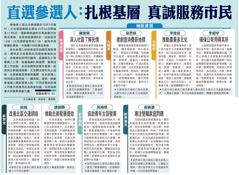 多位參選人紛紛表達其政綱及服務理念,展現多元背景與共同服務香港的決心。參選者包括現任議員、區議員及工商專業人士等,普遍強調扎根基層、重視地區工作經驗。多份政綱聚焦青年發展、經濟民生與區域規劃,尤其關注青年向上流動、北部都會區發展等議題。多名參選人特別指出需把握「一國兩制」優勢,推動香港融入國家發展大局。不同背景的參選人均表示將運用自身專業知識,共同為香港未來發展貢獻力量。\大公報記者 吳俊宏、黃佩琳