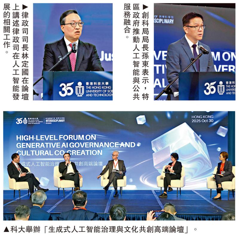 左上圖:律政司司長林定國在論壇上講述律政司在人工智能發展的相關工作。右上圖:創科局局長孫東表示,特區政府推動人工智能與公共服務融合。下圖:科大舉辦「生成式人工智能治理與文化共創高端論壇」。