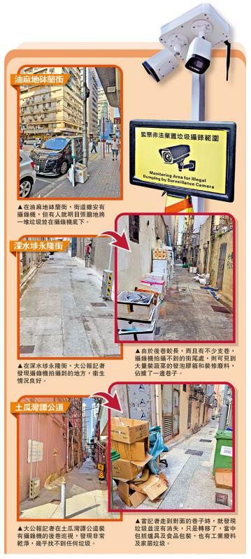 大公報記者於本月11日,先後到油尖旺、佐敦、九龍城、深水埗等地區的垃圾棄置黑點觀察。油麻地砵蘭街雖有安裝食環署的網絡攝錄機,但有一堆垃圾被明目張膽地放在「天眼」底下。這些垃圾多數是發泡膠箱及紙皮,疑是由該處附近的士多店或水果店扔出。記者又發現,部分街道後巷因為放置了「天眼」變得乾淨了,但同時出現「東街不掉,掉西街」的情況,垃圾出現在另一條街。