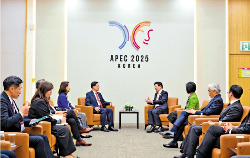 行政長官李家超昨日在韓國出席亞太區經濟合作組織(APEC)相關活動,以及分別與新加坡、阿拉伯聯合酋長國和國際貨幣基金組織的領袖會面。李家超在社交媒體分享說,他和不同經濟體領袖短暫交流,邀請他們多來香港走訪,了解最新發展,期待能為香港不斷鞏固和擴大朋友圈,促成更多合作機會。