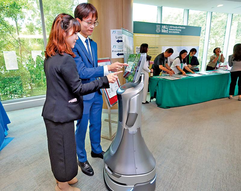 是次論壇為大文集團首次主辦的全英文學術論壇,引入兩部服務引導機器人(見圖)及首度啟用的自助簽到設備。