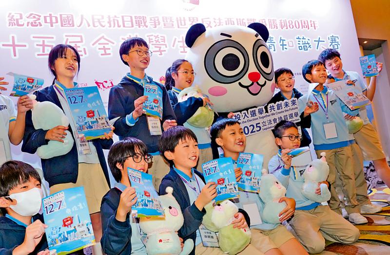 「全港學生中國國情知識大賽」決賽暨頒獎典禮現場氣氛活潑熱烈。全場擺放的關於立法會選舉的海報引人注目,會上嘉賓們不時呼籲踴躍參與,積極投票。
