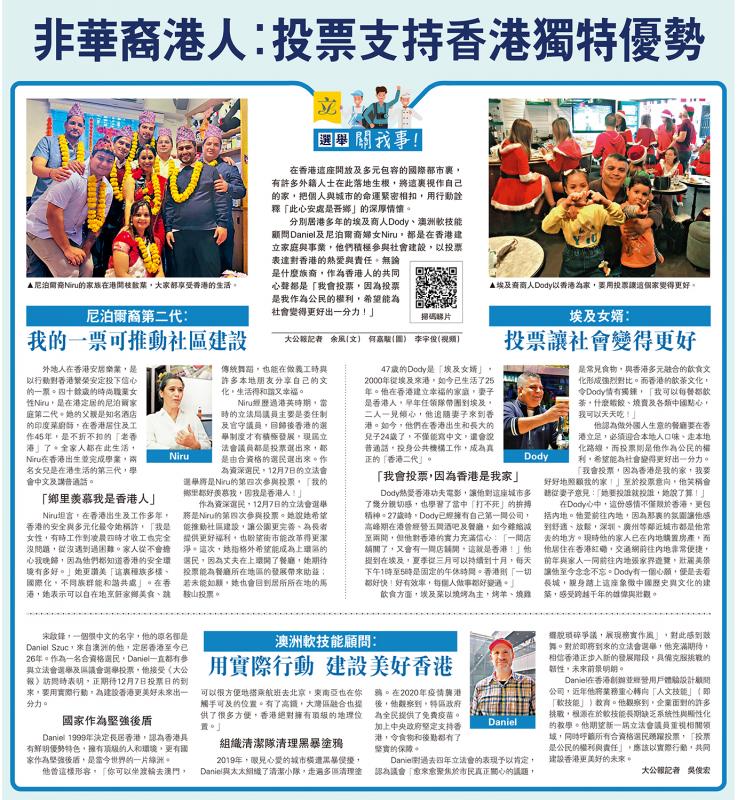 分別居港多年的埃及商人Dody、澳洲軟技能顧問Daniel及尼泊爾裔婦女Niru,都是在香港建立家庭與事業,他們積極參與社會建設,以投票表達對香港的熱愛與責任。無論是什麼族裔,作為香港人的共同心聲都是「我會投票,因為投票是我作為公民的權利,希望能為社會變得更好出一分力!」\大公報記者 余風(文) 何嘉駿(圖) 李宇俊(視頻)